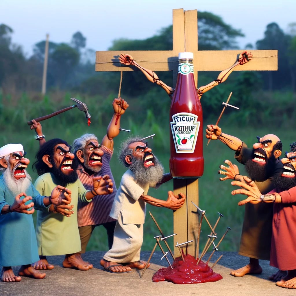 I know he’s a fucking fraud, I just know it. For the easter post, I asked him to give me “a bunch of angry white guys yelling at a bottle of ketchup on a crucifix.” (If you haven’t read that post yet, you probably should; this’ll make more sense.) He spat out two images - the first one was suitable, and made it into the official post. This is the other one: